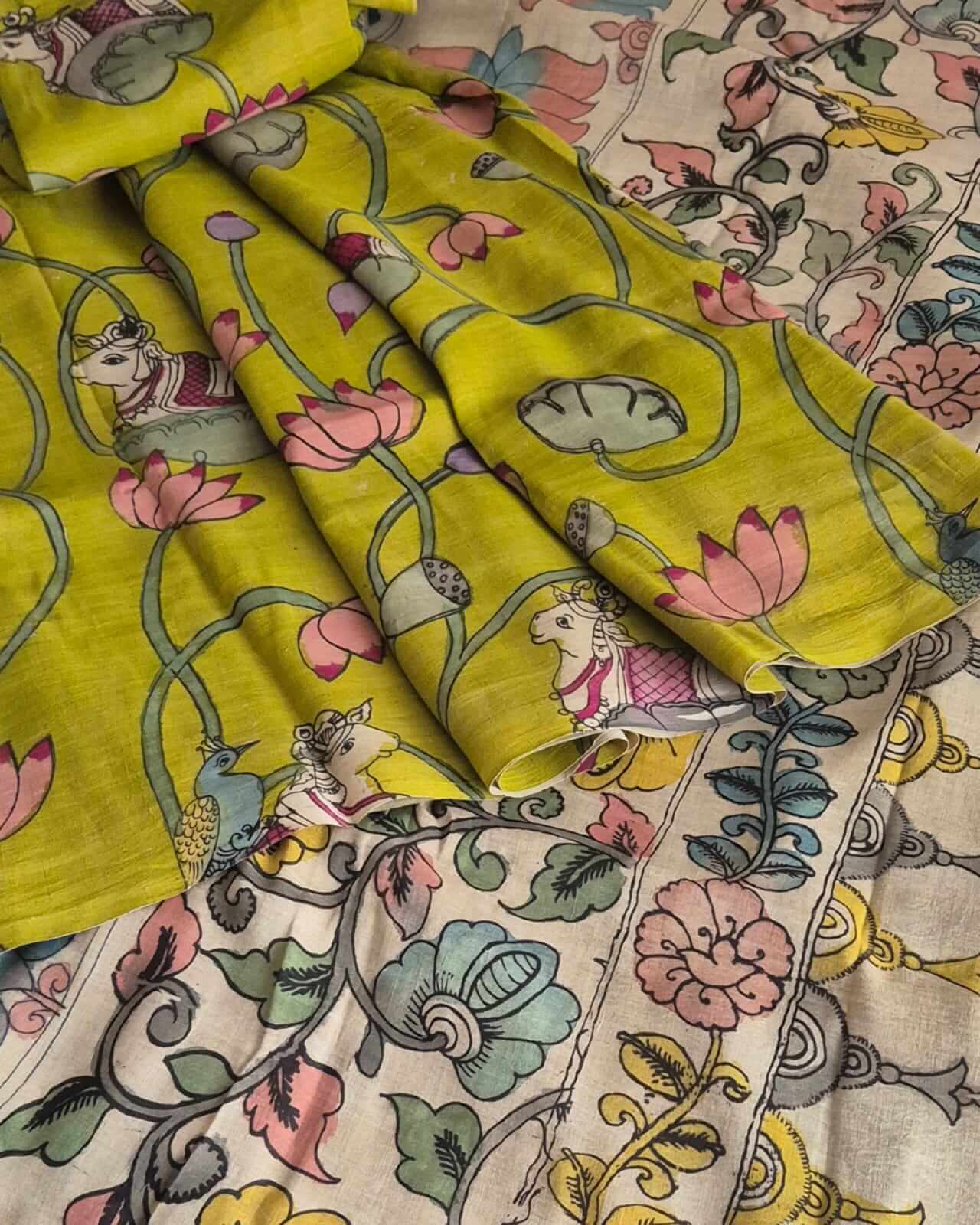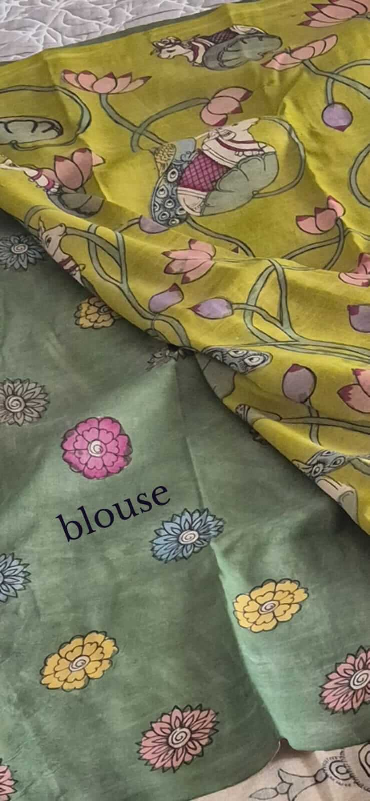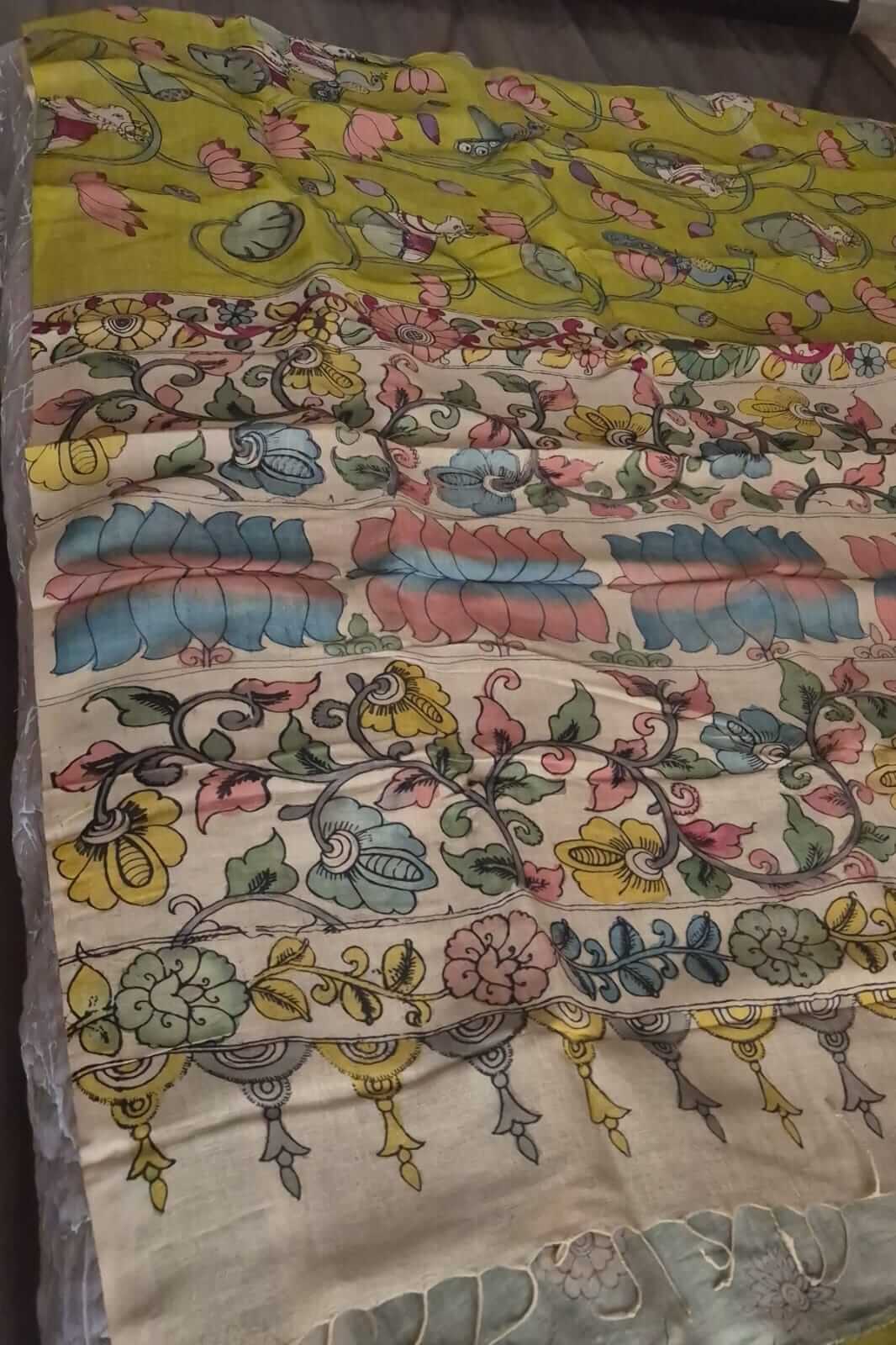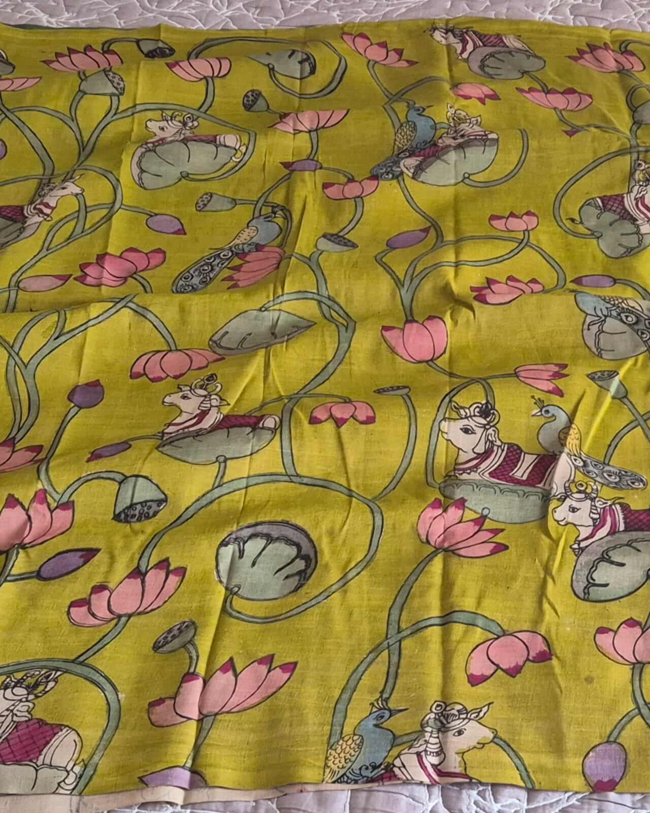 Hand Pen Kalamkari work in organic colours done on Handwoven Cotton Linen saree
