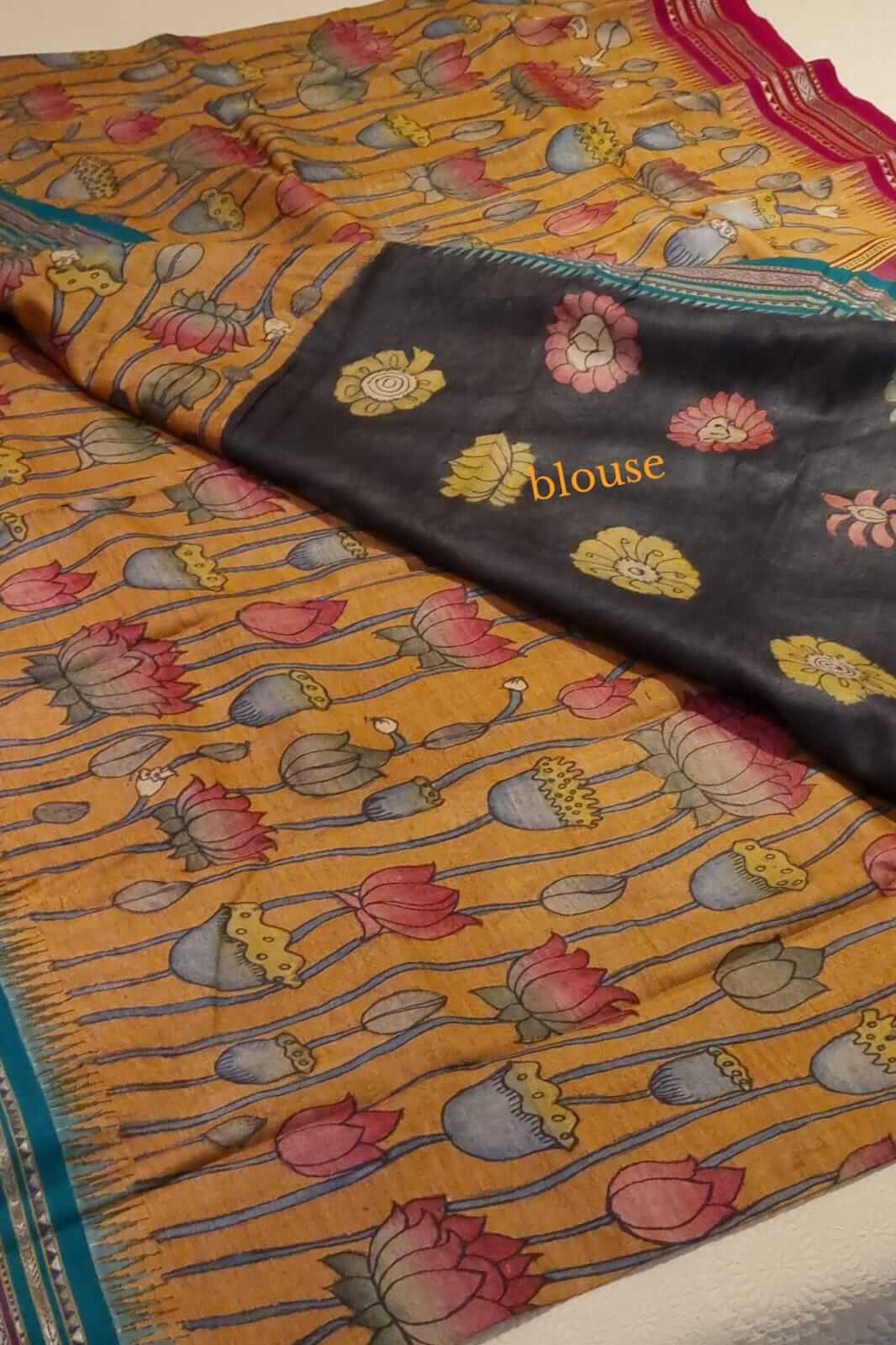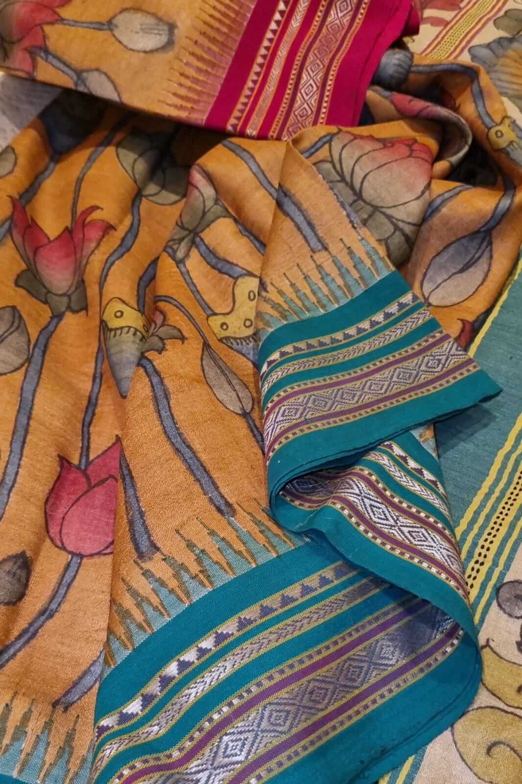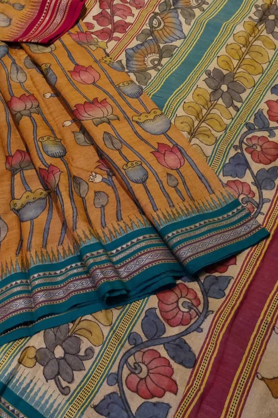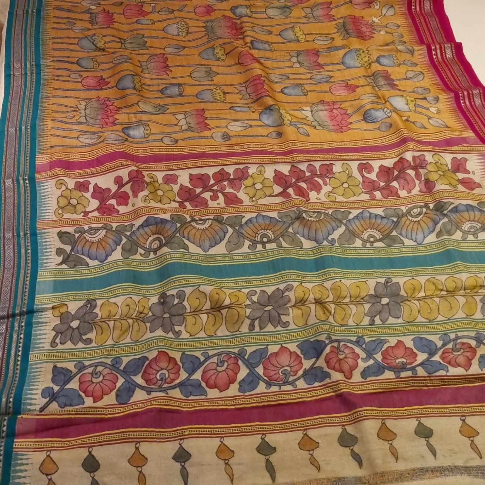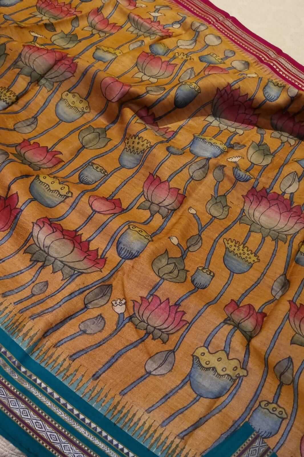 Pen Kalamkari work on Handwoven Vidarbha Tussar silk saree.